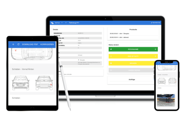 Mit der von uns verwendeten Software, für Web, iOS und Android können Fahrzeugprotokolle mit Bildern und Schadensmeldung erstellt werden.